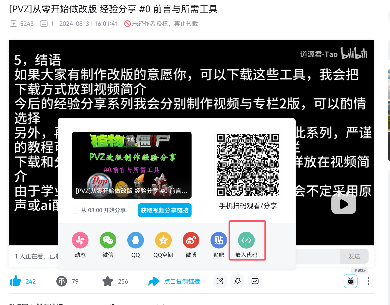 目前最简单的视频插入有b站视频插入,我们打开b站的某个视频,并如下图一样复制嵌入代码